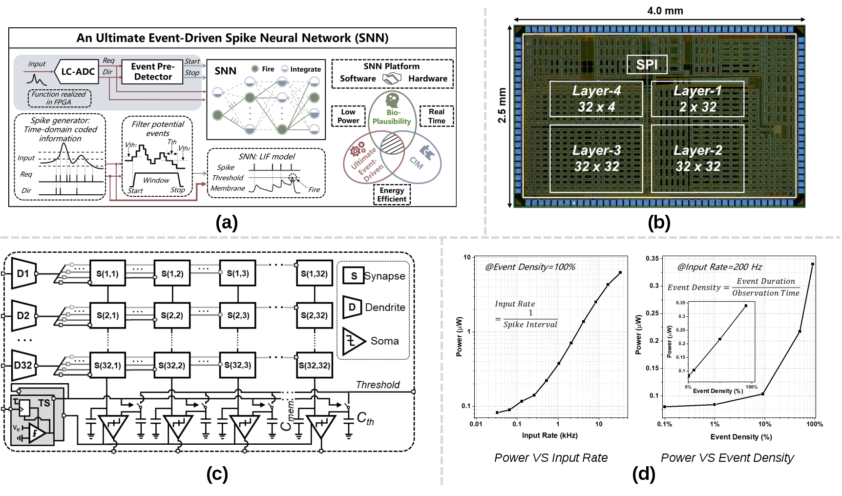 图1. (a)多层级异步事件触发型AIoT芯片解决方案示意图;(b)异步脉冲神经网络芯片的显微照片;(c)异步脉冲神经网络芯片的架构图;(d)芯片功耗测试波形