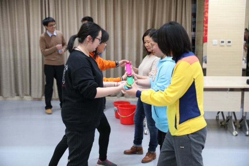 接着进入互动游戏环节。游戏由工会文体委员王媛、姜博岩联手主持,将全体老师分为两队进行比赛。每队15 人,每人至少参加1 个游戏;每队选出1 名队长,由队长分配游戏任务。比赛采用三局两胜制,共设置了乒乓投手、跳跃选果接力和珠行千里三个趣味横生的游戏项目。乒乓投手考验大家的手眼协调能力,老师们精准投掷,展现了不凡的协调与技巧;跳跃选果接力中,大家身手矫健,配合默契,将速度与智慧完美结合;而珠行千里游戏,则更是考验了大家的耐心与团队协作能力,每一颗珠子的顺利传递都凝聚着团队的智慧与汗水。