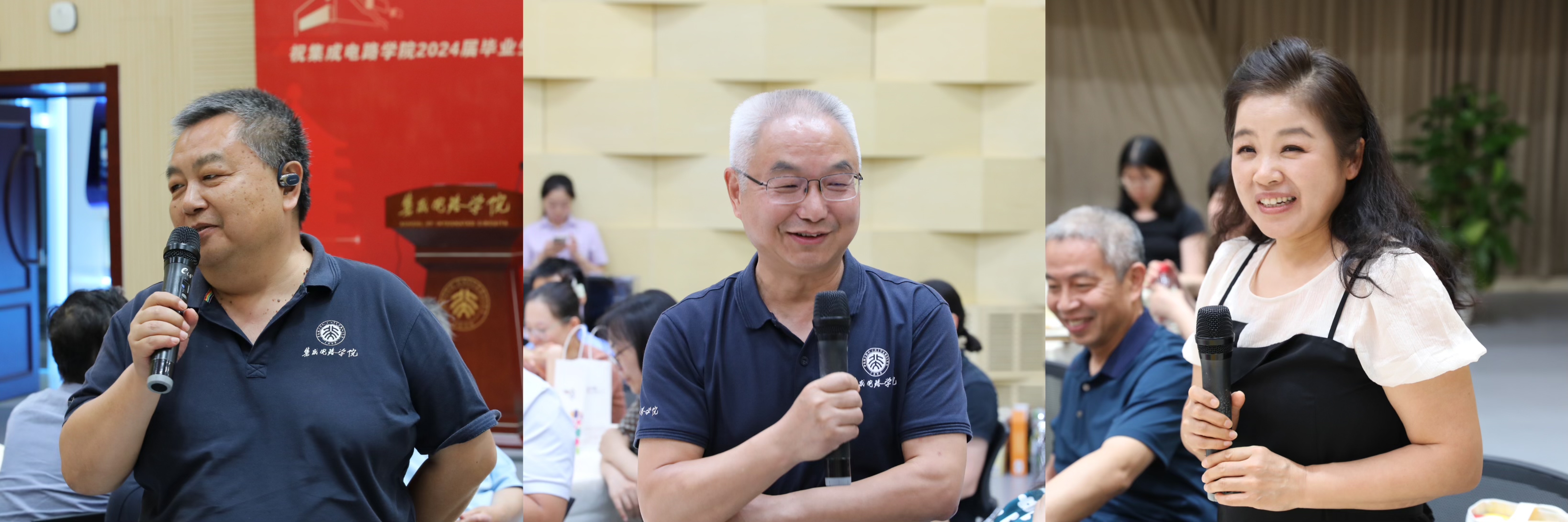 随后,由赵前程主持荣休座谈环节,邀请了与荣休教师代表郝一龙、金玉丰、解冰三位一起工作的多位老、中、青教师代表及学生代表发言。在老照片回顾的背景下,张大成、李志宏、高成臣、张锦文、于晓梅、吴文刚、刘晓彦等老师深情回顾了自己刚结识三位荣休老师时的青涩与憧憬,到现如今步入退休之年,不仅感慨时光荏苒,记忆如梭;谈到当年一起为教学及科研奋斗的日夜,虽时过境迁,仍记忆犹新;提到当年的趣事及过往,仍浮在耳畔,恍如昨日。王玮、杨振川、张威等老师分享了三位荣休教师对自己工作、生活上的帮助,表达了对他们深深的感激之情。学生代表发言时播放了学生们发来的祝福视频,幽默的语言让现场爆发出阵阵笑声。解冰老师多才多艺,在工作之余积极参加学校、学院组织的各项活动,学院工会为她制作了“北大30年快乐瞬间”小视频,收录了多年来她参加各项活动的老照片,一张张欢乐的照片仿佛将时间定格,让大家沉浸在美好的回忆中,心中满是对过往岁月的怀念与珍惜。