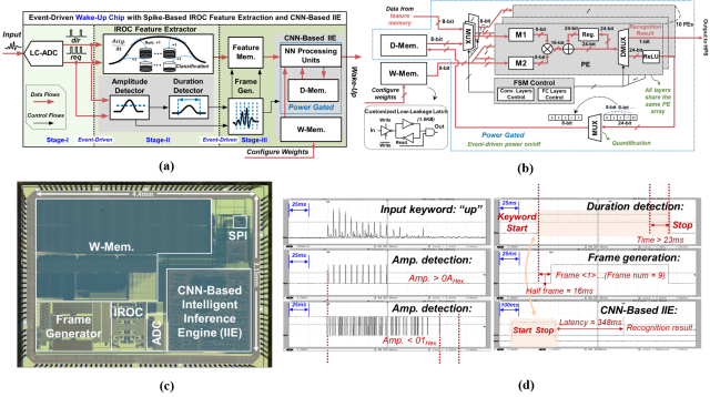 图1. (a)异步事件驱动型AIoT芯片架构, (b)卷积神经网络电路架构, (c)芯片显微照片,