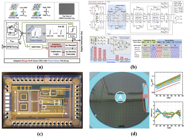 黄如院士-叶乐副教授课题组,与浙江大学、浙江省北大信息技术高等研究院合作,提出了国际领先的动态电荷域电容传感技术,具有国际领先的传感精度,在实现高精度的同时显著降低了物联网传感节点的功耗;课题组同时提出了基于动态范围自适应滑动技术(Adaptive Range-Shift, ARS)的缩放型(Zoom)电容数字转换器(Capacitance-to-Digital Converter,CDC),解决了Zoom架构中冗余过大造成的精度损失和抗片外寄生/干扰能力差的问题;还提出了基于功耗自感知技术(Power-Aware)的悬浮反相器型放大器阵列,解决了兼容不同传感终端所带来的能效损失问题,显著延长了多应用兼容传感芯片的电池使用寿命。