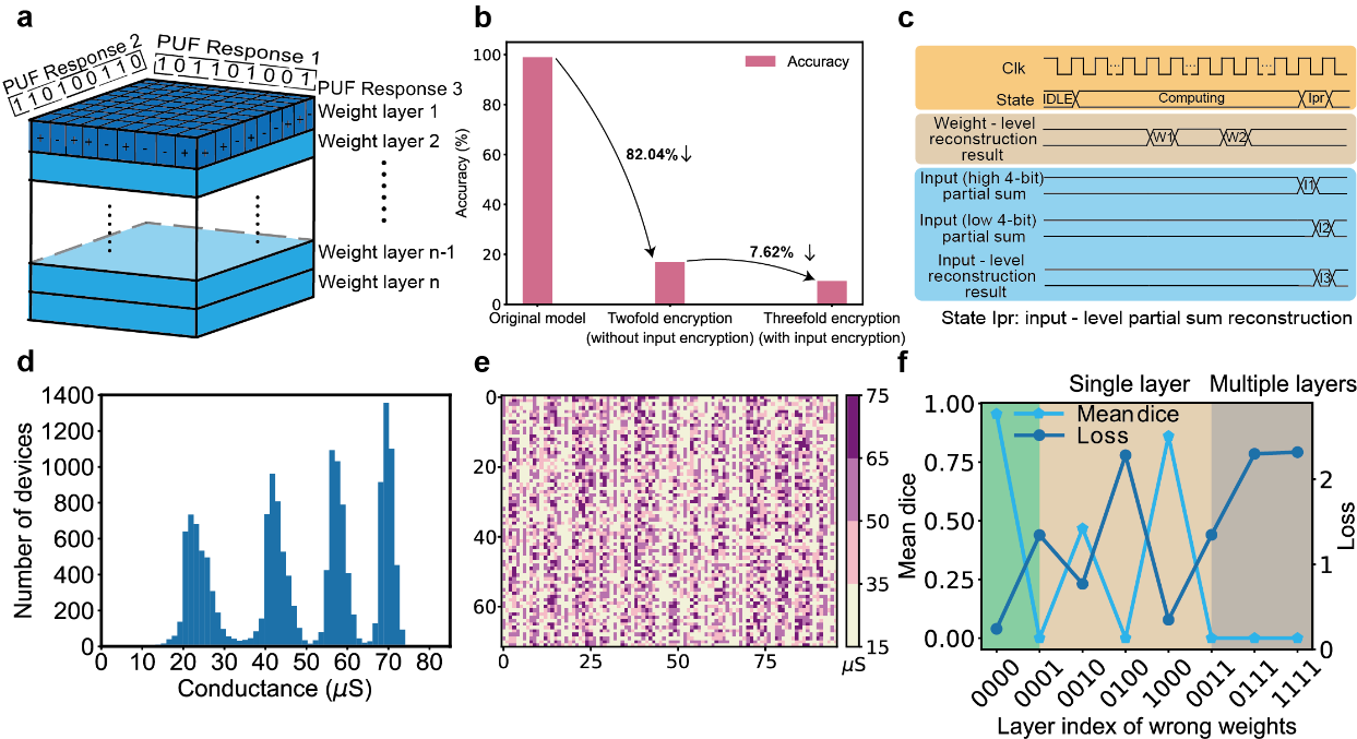 基于电阻式随机存取存储器 (RRAM) 的存内计算 (CIM) 已成为一种具有高度发展潜力的技术,可用于加速边缘设备上的神经网络。 存内计算可以直接在存储器中执行乘法累加操作,从而显著减少频繁的数据传输并提高能效。然而,由于RRAM 的非易失性特性,使用者可以在计算过程中从存内计算内核中提取存储的神经网络权重。物理不可克隆函数(PUF)是一种利用每个实体的固有随机性为每个实体提供唯一信息的器件。过去的工作曾提出,PUF能够用于保护神经网络的知识产权,但是其硬件开销仍然较高。目前仍缺乏有效实施PUF和存内计算核心集成的方法,以提供有保护且高效的人工智能推理。
