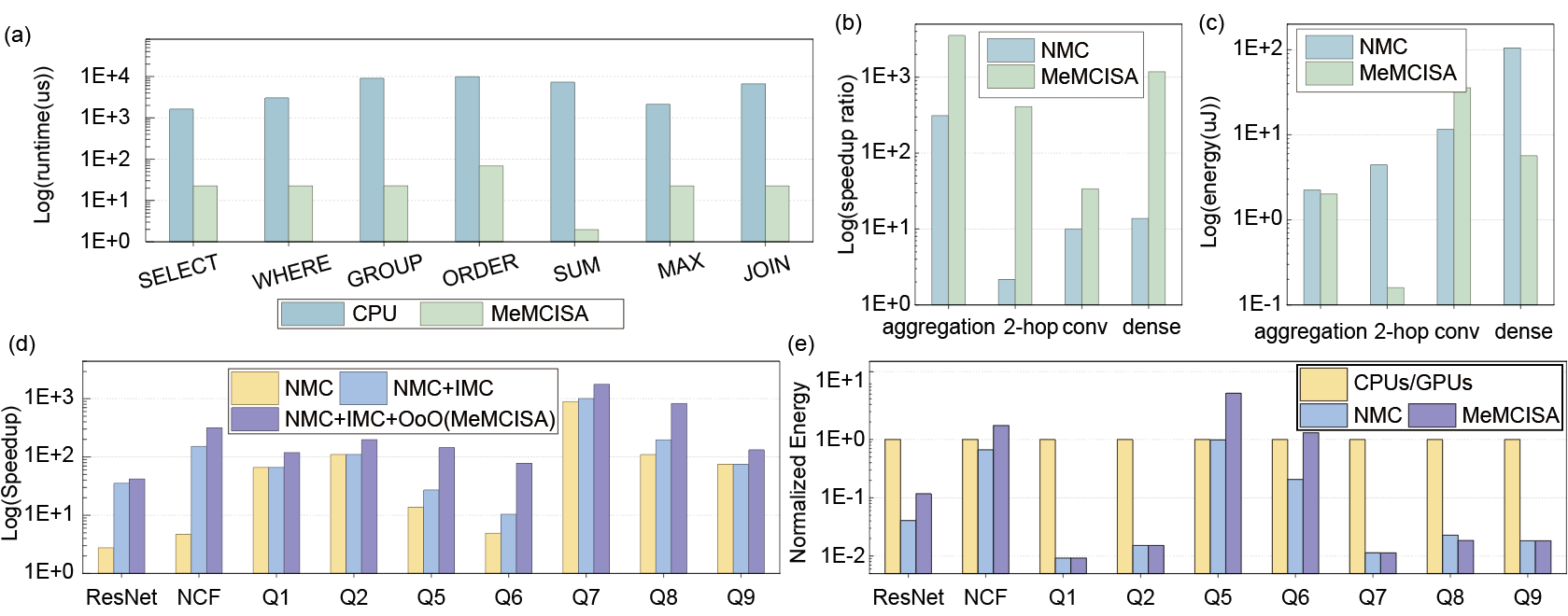 为了评估MeMCISA架构的性能,团队设计了一个端到端的仿真框架,具有单命令模式和代码块模式两种操作模式。其中,代码块模式能够根据带有MeMCISA标签的PyTorch/SQL代码块生成相应的汇编格式指令,并在架构中调度和执行这些指令。如图3的实验结果显示,MeMCISA架构在执行单条命令时,处理速度较传统架构提升了33.86倍至3561.56倍,而在处理多种数据库工作负载时,提升了41.84倍至1767.70倍。此外,MeMCISA的能耗相较于传统架构同样有所降低。