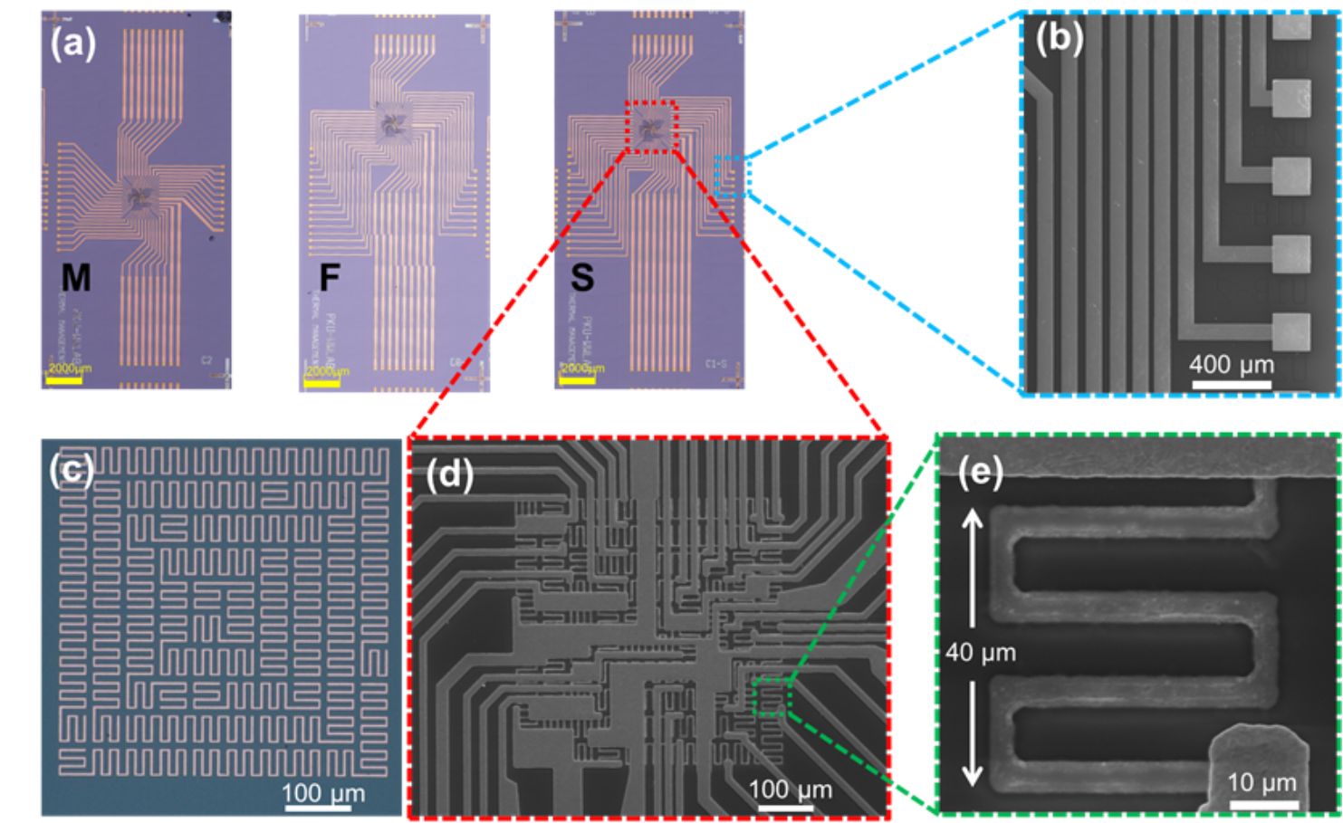 、微米纳米加工技术全国重点实验室、集成电路高精尖创新中心王玮教授团队提出了一种双“H”歧管型嵌入式微通道散热方案,同时在该微通道散热器上集成了尺度可调的发热阵列,在不同工作模式下测试了微通道散热器对于不同尺寸热源的散热性能。经过实测,该微通道散热器针对500 × 500 μm2热源的散热热流密度达到1200 W/cm2以上,平均温升小于60℃,对流换热系数达到1.5×105W/(m2∙K)。此外,该工作还基于实验数据构建了热流耦合仿真与理论模型,系统总结了在多场景下电子器件典型结构中的热汇热阻、一维传导热阻和扩散热阻的变化规律。研究发现,在基底尺寸固定的情况下,热点的尺寸从小到大的变化会导致器件中的主要热阻从扩散热阻转变至热汇热阻,因此针对点热源和面热源需要根据其主要热阻的转变趋势采用不同的散热手段。