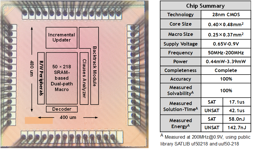 团队提出首款支持完备性验证的K-SAT专用集成电路求解器SKADI,通过硬件架构创新确保解空间的穷尽性探索。提出的SKADI架构具有两个核心特征,分别是dual-path SRAM-based macro单元与incremental updating策略:前者通过前向计算和后向检索实现了高效的子句-文字双向推导,而后者采用路径回溯压缩技术达成历史赋值信息核心节点的线性存储。在28nm工艺节点上,该设计以0.2mm²的核心面积实现硬件级完备性验证,针对uf50-218标准算例达成平均17.1μs的求解时间,运行功耗稳定在3.39mW。
