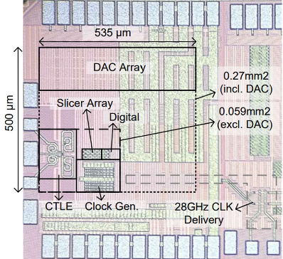 团队提出了一种多单元CTLE电路,可以同时取得较高的增益和较小的调节步长,实现了高于59GHz的模拟带宽;此外,通过提高CTLE的峰值频率减小了群延迟的波动,降低对FFE抽头数量的要求,仅使用三抽头就能在13.6dB衰减信道下实现8.1e-7的误码率;还提出了一种基于相位插值器及非线性预失真的八相位时钟产生电路,在不使用注入锁定环形振荡器的条件下,产生八相位14GHz时钟,相位误差低于3.6度。基于上述技术,研究团队使用12nm工艺流片验证了一款224Gb/s极短距接收机芯片,实现了当前模拟接收机的最高速率;能耗仅为1.11pJ/b,优于3nm工艺的数字接收机。