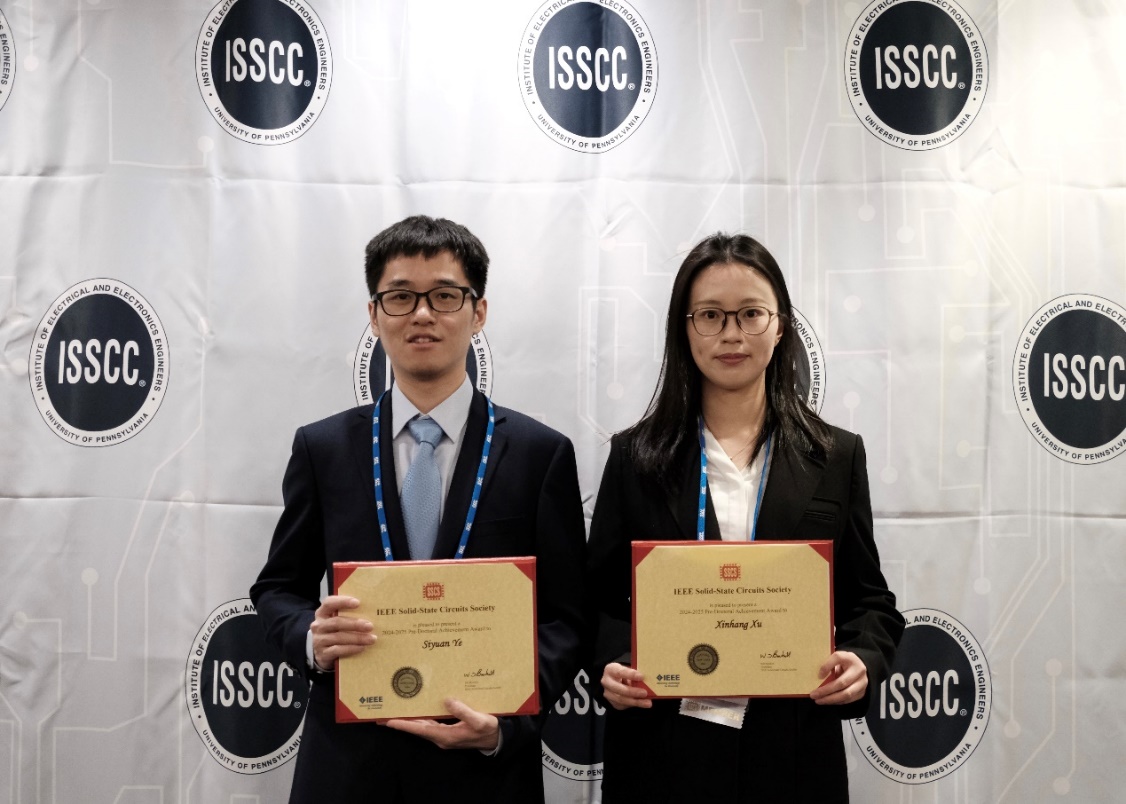 在此次盛会上,博士生叶思源、许欣航获得2024-2025年度SSCS国际固态电路协会博士成就奖(2024-2025 SSCS Predoctoral Achievement Award)。叶思源目前是博士五年级,研究方向是高速高精度ADC设计,已发表16篇高水平论文,包括3篇第一作者ISSCC论文和1篇第一作者JSSC论文;许欣航目前是博士三年级,研究方向是高精度模拟信号链和ADC设计,已发表15篇高水平论文,包括1篇第一作者ISSCC论文和多篇第一作者CICC、ESSCIRC等论文。叶思源的博士生导师为张兴教授、沈林晓研究员,许欣航的博士生导师为沈林晓研究员。