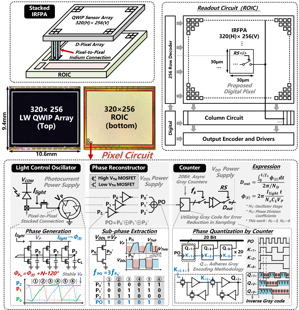 该工作面向高性能长波红外探测和成像应用,针对传统长波红外动态范围受限、功耗高以及传输串扰严重等难题,提出了光电流自驱动调制器、相位抽取电路和异步格雷码计数器结合的高动态、高能效比20bit像素级ADC架构,以及低摆幅、低串扰的传输架构,实现了低功耗、低噪声等效温差(NETD)、高动态范围的红外焦平面成像芯片。