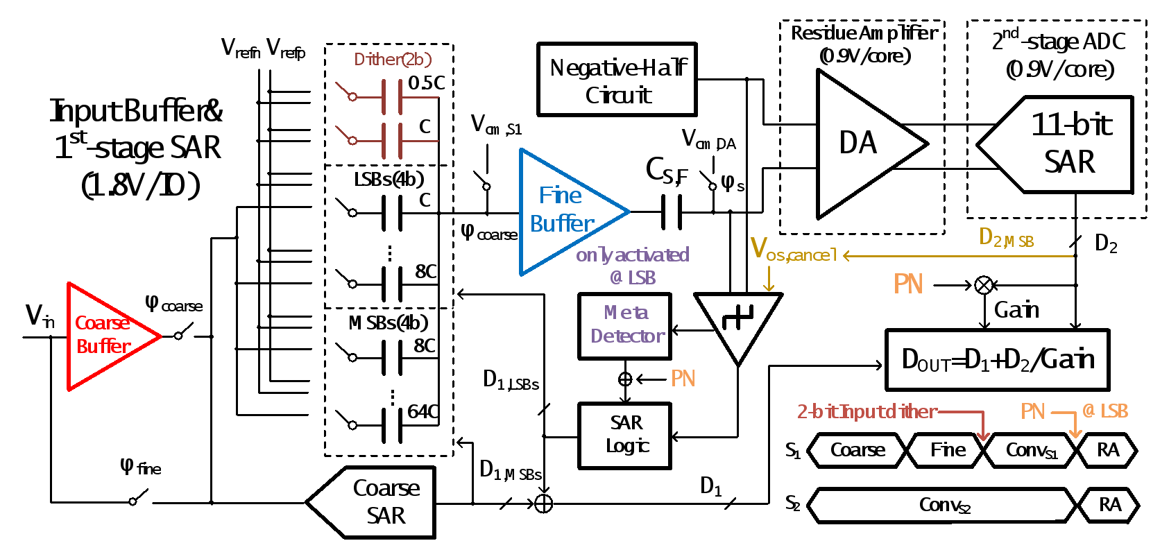 该工作面向通信、医学成像等需求,针对不断提升的高能效模数转换器的需求,提出并实现了一款高精度、高能效的16MS/s流水线-逐次逼近型模数转换器系统(Pipelined-SAR ADC)。该系统采用了分裂粗细输入缓冲器采样方案,并提出了一种快速且具有PVT鲁棒性的后台级间增益校准技术。通过这种方案,系统能够实现轨到轨高线性度的信号采样与量化,并在系统层面显著提高了能效,突破了传统架构中的能效瓶颈。