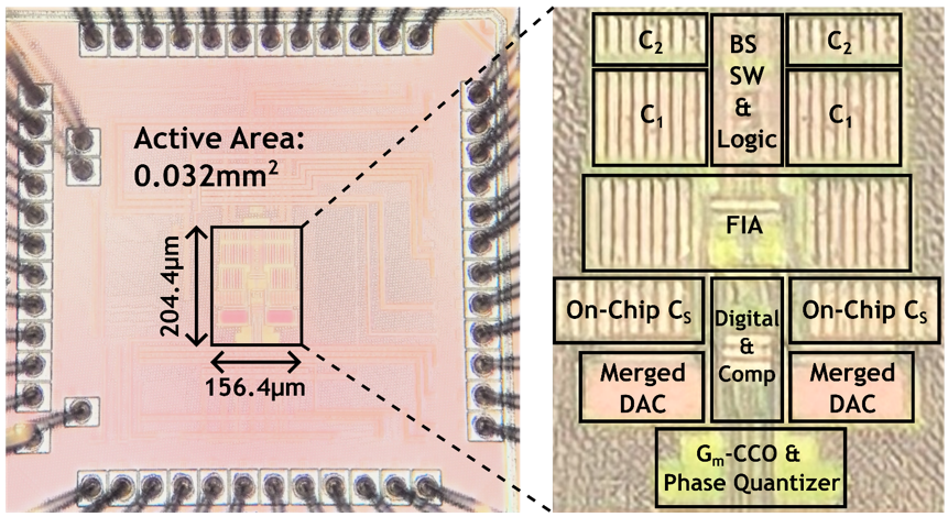 团队研制了一款增量型缩放式电容-数字转换器芯片,该芯片采用基于斩波的采样噪声消除技术,低成本地解决了采样噪声问题;提出了一种适用于压控振荡器的相位域前馈补偿方法,充分利用离散时间Delta-Sigma调制器的时序特点,保证环路的稳定;同时,该芯片还利用自适应偏置浮动反相放大器构建第一级积分器,进一步提高了系统的能效。