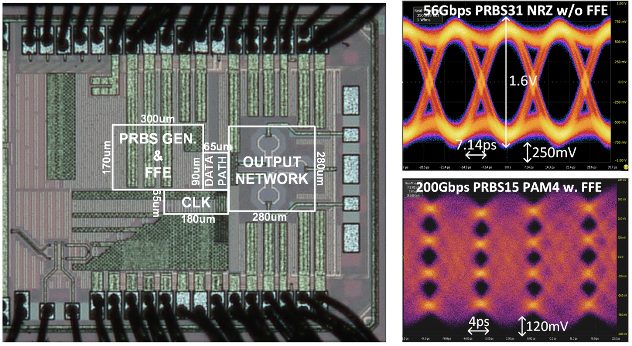 针对该问题,盖伟新教授团队研制了一款基于CMOS工艺的超高速大摆幅发送机芯片,研究并提出了一种新型驱动级电路,提高电路耐压范围的同时减小负载,提升驱动级电路带宽;同时,设计了一种低抖动脉冲发生器电路,将脉冲信号边沿抖动压缩至类似工作的十分之一以内。此外,团队还研制了一种高精度正交时钟产生电路,能够检测和校准多种超高速多相时钟所面临的相位误差。基于以上技术,团队采用12nm CMOS工艺完成了流片验证,并进行了性能测试和汇报。发送机芯片数据速率达到200Gb/s,驱动摆幅达到1.6Vppd,与已有的200G CMOS发送机相比实现了最大的驱动摆幅,驱动级电路功耗与SiGe驱动器芯片相比仅为15%,达到了国际领先水平。