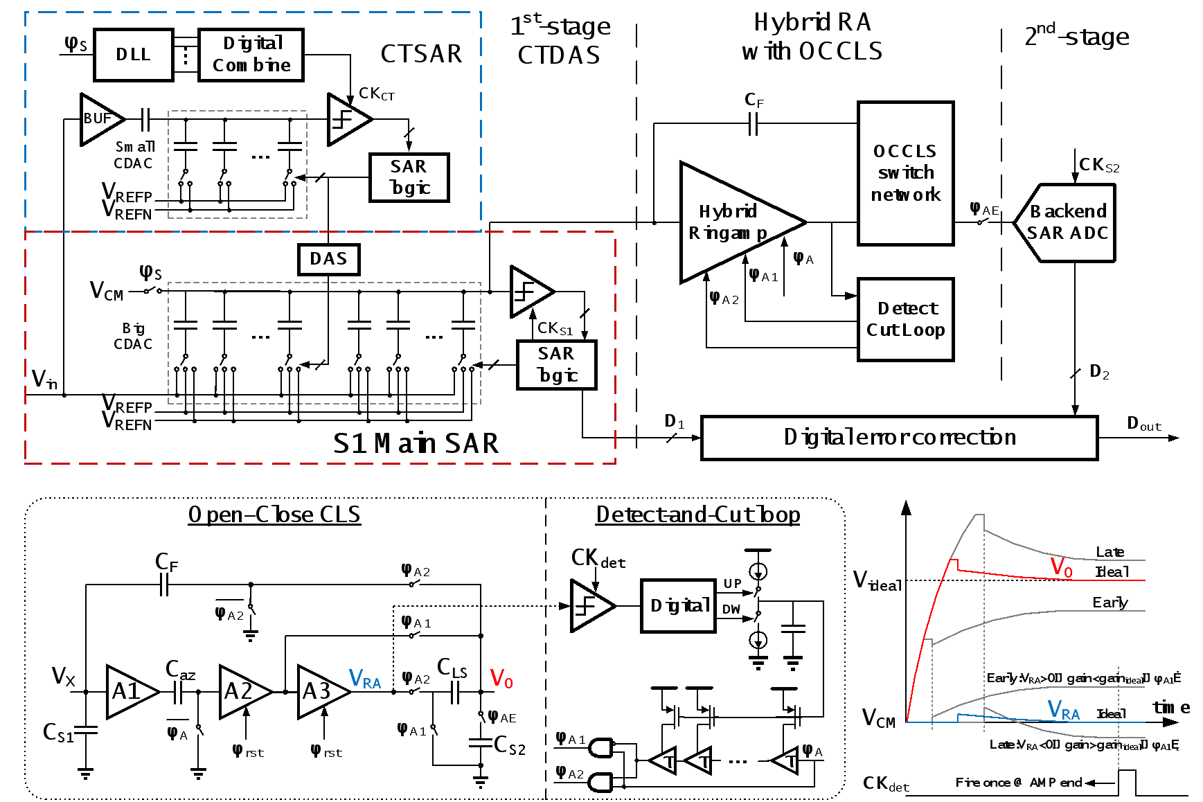 黄如院士-叶乐教授团队,针对转换级和级间放大器两个方面提出解决方案。转换级方面,本工作提出了基于连续时间逐次逼近型模数转换器的采样转换并行技术,创新性地将模数转化器的采样过程与高位量化过程并行起来,从而在保持高能效的同时显著缩短转换级的采样转换时间,提升了整体的速率;级间放大器方面,本工作首次提出了基于先开环后闭环的相关电平抬升技术,利用开环放大显著提升余量放大的速率,同时采用了自检测切断环路用于实现工艺电压温度鲁棒的高增益。此外,本工作还提出了混合静态-动态环形放大器的电路架构,显著提高了级间放大器的噪声和能效性能。在提高采样转换速率的同时,本工作实现了高速高精度模数转换器的能量效率世界纪录,相较现有工作将能效提升将近一倍。