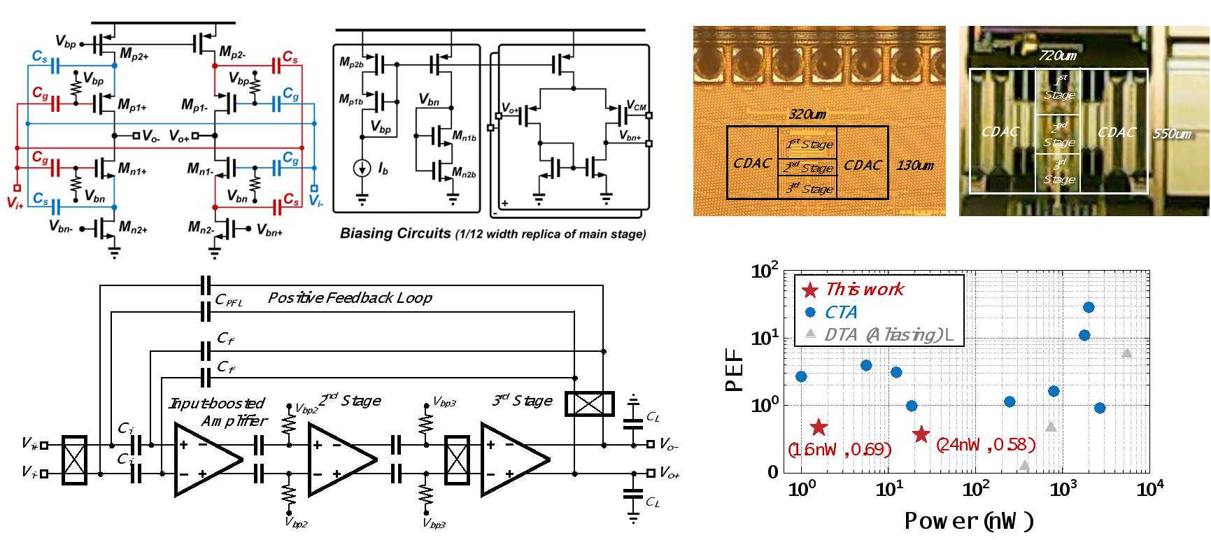黄如院士-叶乐教授团队,提出了基于输入倍增技术的高能效放大器:该技术创新性地提出了输入信号倍增技术,将输入耦合到输入对管的栅极与源极从而提升其等效增益,在相同的功耗下实现了更低的噪声水平。与此同时,针对超低功耗应用中的漏电问题,采用漏电补偿技术解决了寄生阱二极管与开关衬底漏电导致的直流偏置偏移问题。