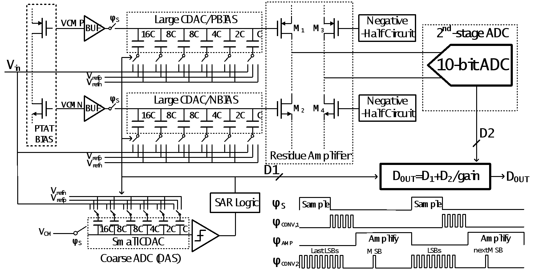 黄如院士-叶乐教授团队,首次提出了共源共栅的容性源极负反馈的动态放大器和最高位提前转换技术:其中共源共栅的容性源极负反馈的动态放大器改良了之前的技术,具有高线性度和高增益的特点,同时采用了温度补偿的电流偏置方案提升了PVT涨落下的性能鲁棒性。而另一方面,最高位提前转换技术在余量放大的过程中进行了第二级最高位的转换,这不仅进一步提高了动态放大器的输出摆幅,同时让第二级的最高位切换更快稳定。值得一提的是,这个技术获得的这些好处并不需要引入额外的硬件开销。利用以上技术,本工作提出了一个高能效、高增益、高线性度、高输出摆幅且PVT鲁棒的动态放大器,并实现了一个高能效的流水线-逐次逼近型模数转换器芯片。