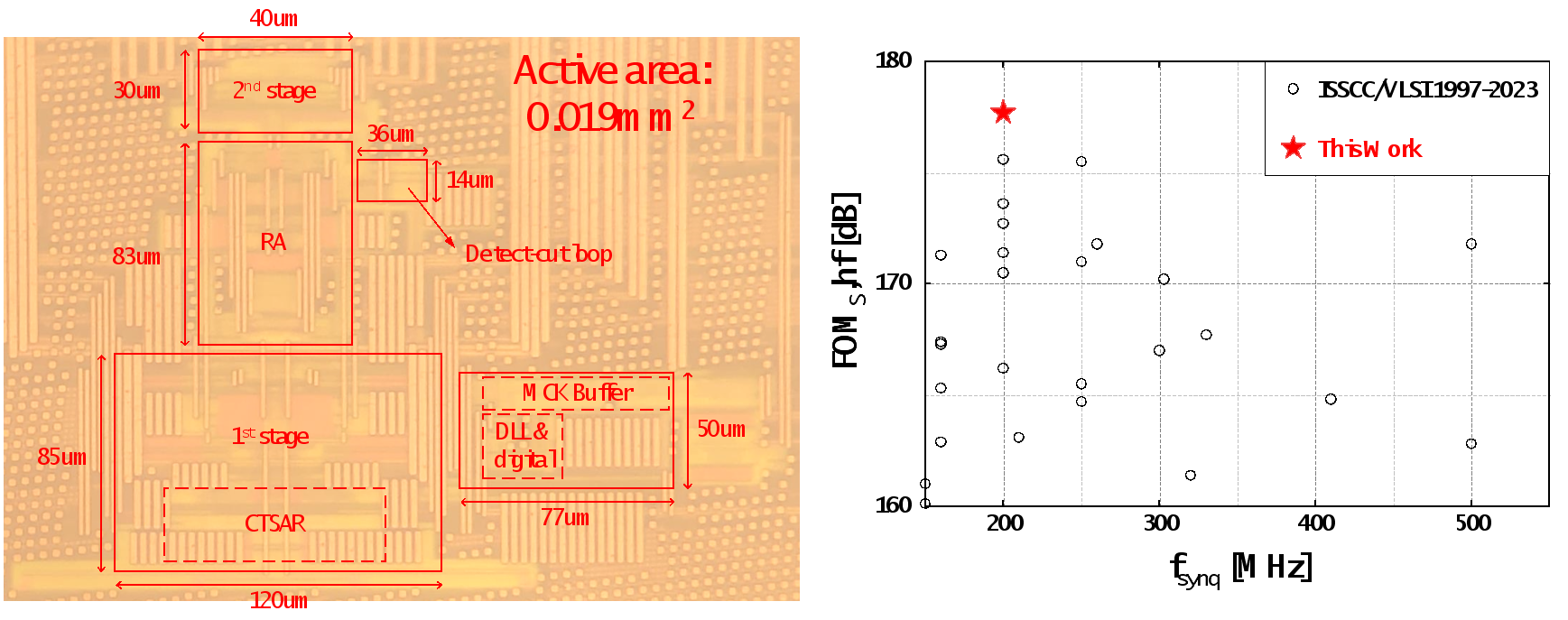 基于上述架构和电路层面的创新,课题组研制了一款基于22nmCMOS工艺的高能效流水线-逐次逼近型模数转换器,该电路在奈奎斯特输入下达到了73.9dB的SNDR,仅消耗0.36mW。这达到了目前在相同或更高采样率的模数转换器中能效的世界纪录(FoMs=182.3dB)。