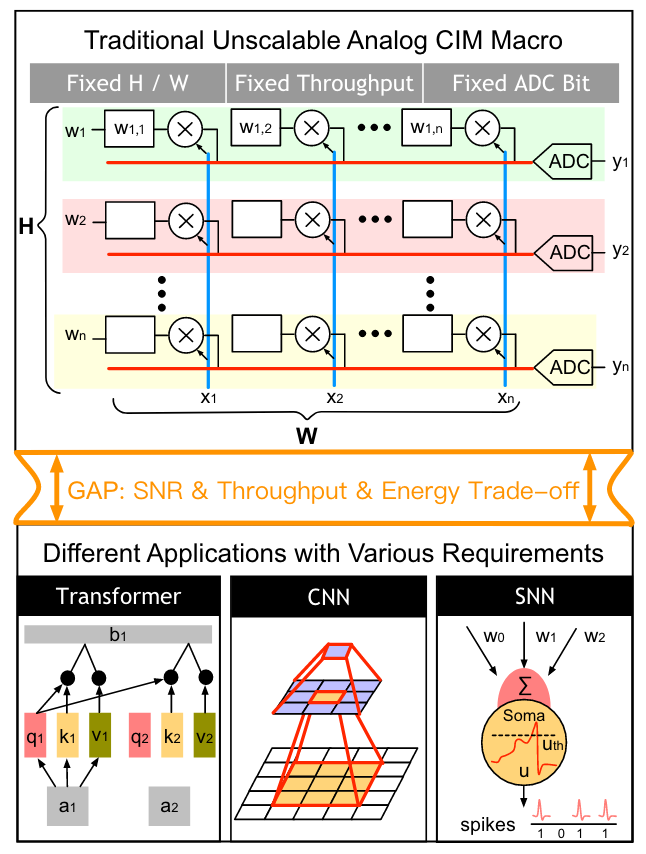 模拟存内计算(ACIM)是一种新兴架构,可用于执行高效的人工智能边缘计算。然而,目前的 ACIM 设计通常具有不可扩展的拓扑结构,并且仍然严重依赖人工操作。这些弊端限制了 ACIM 的应用场景,并延迟了设计者的设计时间。针对该问题,林亦波研究员-王润声教授团队提出了一种基于可合成架构的端到端自动化 ACIM(EasyACIM)。在给定阵列尺寸和定制单元库的情况下,EasyACIM 可以端到端自动生成具有各种设计规范的 ACIM 布局。利用基于多目标遗传算法(MOGA)的设计空间探索器,EasyACIM 可以基于所提出的可合成架构获得高质量的 ACIM 解决方案,从而满足各种应用场景的需求。与最先进的(SOTA)ACIM 相比,EasyACIM 提供的 ACIM 解决方案具有广阔的设计空间和极具竞争力的性能。该工作以《EasyACIM: An End-to-End Automated Analog CIM with Synthesizable Architecture and Agile Design Space Exploration》为题发表(博士生张昊懿为第一作者,林亦波研究员为通讯作者)。