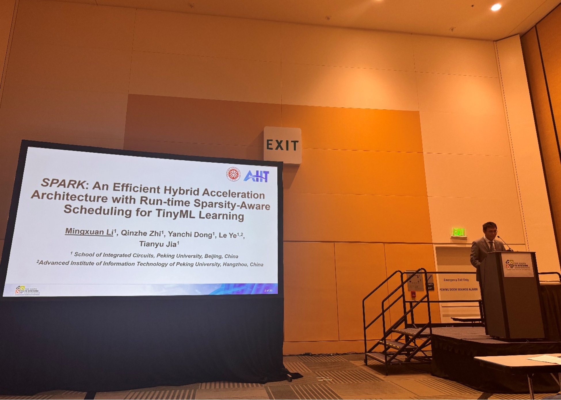 随着人工智能(AI)技术的不断发展,对于边缘端AI芯片的需求,如物联网(IoT)芯片,也在迅速增长。这对于资源有限的边缘端芯片来说无疑是一项巨大的挑战。特别是,设计一款既能支持推理又能支持训练的边缘端AI芯片是一项极具挑战性的任务。这需要我们在计算能力、能效比、内存带宽和存储容量等多个方面进行精细的优化和平衡。同时,我们还需要考虑到芯片的体积和成本,以满足边缘设备的实际需求和应用场景。针对上述问题,黄如院士-叶乐教授、贾天宇研究员团队提出了一种名为SPARK的高效混合加速架构,该架构能在训练TinyML网络时实时捕捉稀疏信息,并实现动态调度功能。除了独立的总线外挂加速器外,还在CPU流水线中实现了一个与流水线紧耦合的加速单元,以支持同时的前向和反向传播。为了更好地利用稀疏性并提高硬件利用率,该工作实现了一个能够实时捕捉稀疏信息的调度器,用以在两个加速单元之间调度工作负载。该工作使用台积电22纳米工艺实现了SPARK,并评估了不同的TinyML任务。SPARK在性能上比商用的边缘端设备高出9.4倍,效率高出446.0倍。该工作以《SPARK: An Efficient Hybrid Acceleration Architecture with Run-time Sparsity-Aware Scheduling for TinyML Learning》为题发表(本科生李明轩为第一作者,贾天宇研究员为通讯作者)。