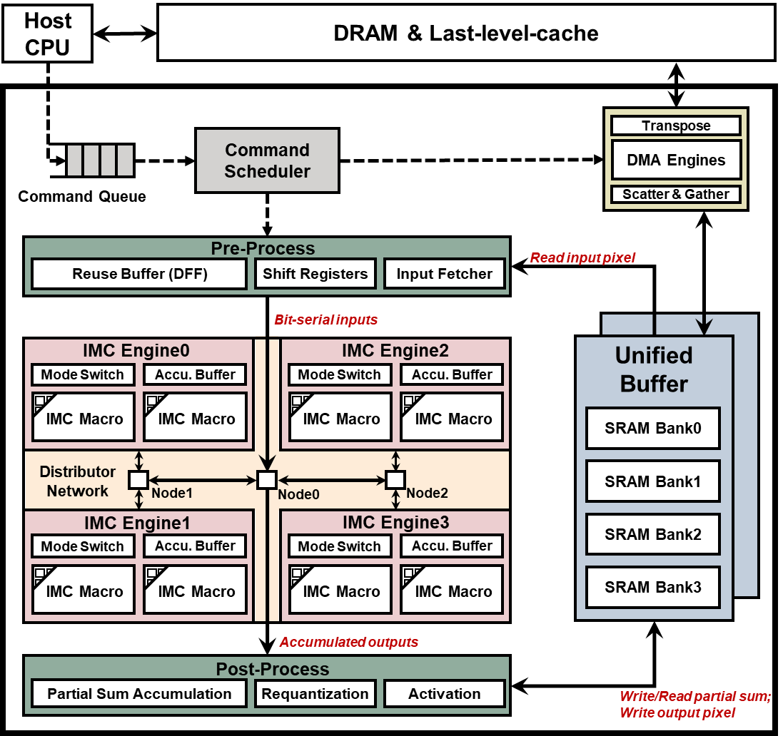 近年来,具有多头注意力(MHA)机制的 Transformer 模型在计算机视觉任务中展现出了良好的表现。 然而,视觉Transformer(ViT) 缺乏归纳偏置,导致大量的计算和存储需求,使其难以在资源受限的边缘设备上部署。为此,涌现出了一批具有混合网络结构的多尺度ViT模型,以充分结合Transformer 与卷积神经网络(CNN)两者的优势。 然而,现有的领域专用架构侧重于单独对卷积或 MHA 进行优化,且无法支持多尺度结构下灵活多变的层尺寸,缺乏灵活性与通用性。针对以上问题,黄如院士-叶乐教授、马宇飞研究员团队提出了一种存算一体(IMC)的AI加速器,通过引入流水线重排,有效加速具有混合卷积-MHA拓扑的多尺度ViT模型。 SRAM 数字 IMC 宏被用于缓解内存访问瓶颈,同时避免模拟非理想性。 此外,该工作中研究了可重构处理引擎和互连,以实现不同尺度下卷积和 MHA 的自适应映射。实验结果表明,相比基准设计,在典型的ViT工作负载下,所提出的架构可降低44.1%~55.9%的能量-延迟积(Energy-Delay-Product,EDP)。该工作以《An In-Memory Computing Accelerator with ReconfigurableDataflow for Multi-Scale Vision Transformerwith Hybrid Topology》为题发表(博士生陈至远为第一作者,人工智能研究院马宇飞研究员为通讯作者)。