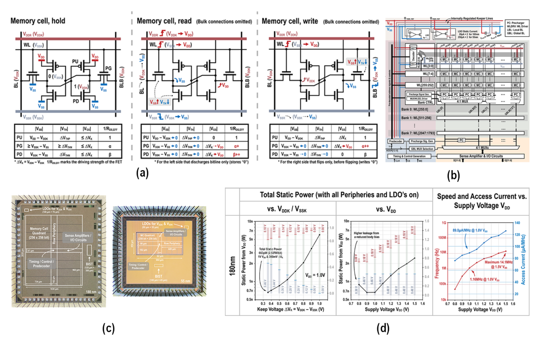 图2. (a) SRAM单元电路拓扑的示意图;(b) SRAM阵列拓扑的示意图;(c)基于180nm与55nm工艺的256kbSRAM芯片的显微照片;(d)静态功耗、动态功耗、速度的测试结果
