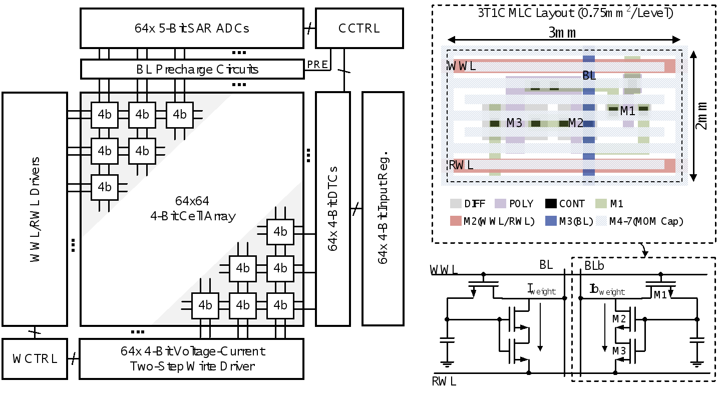 该工作以A Calibration-Free 15-level/Cell eDRAM Computing-in-Memory Macro with 3T1C Current-Programmed Dynamic-Cascoded MLC achieving 233-to-304-TOPS/W 4b MAC为题,发表于今年CICC,文章的第一作者是blh漫画