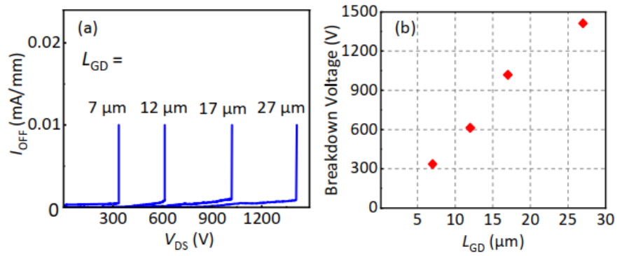 图3. GaN高压功率晶体管原理图、击穿特性测试结果、击穿电压与器件尺寸关系图