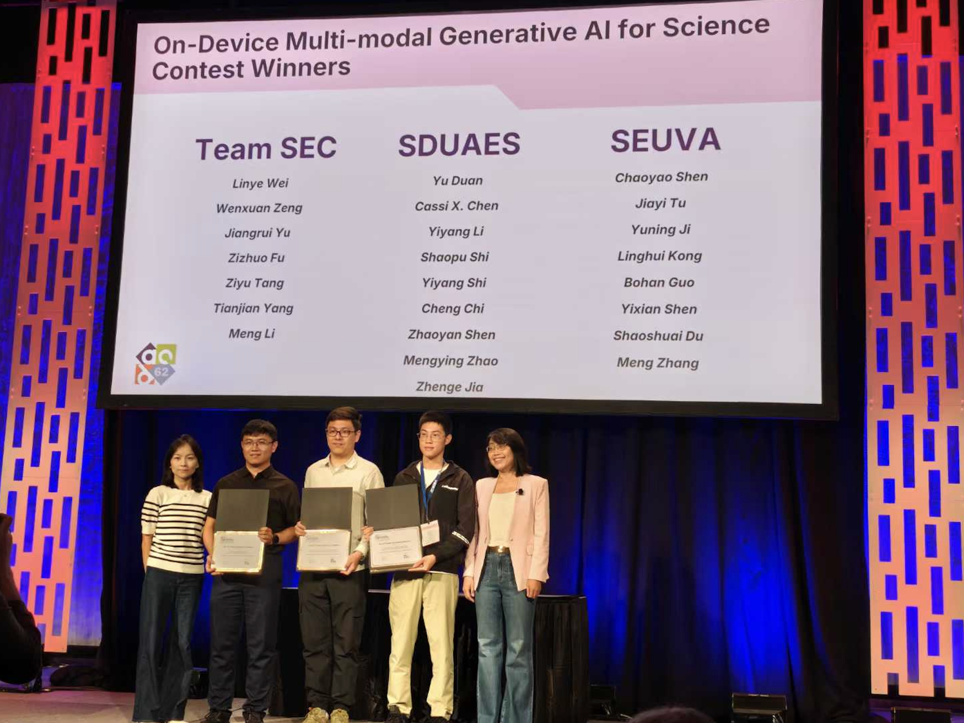 设计自动化与计算系统系的三位博士生韦临烨、曾文轩、俞江瑞和来自信息科学技术学院电子信息科学类实验班(信班)的三位本科生傅子酌、汤子瑜、杨天健。DAC系统设计竞赛由美国计算机学会(ACM)设计自动化专业委员会(SIGDA)赞助,竞赛组织者来自美国乔治梅森大学、北卡罗来纳大学教堂山分校和电子科技大学。本次比赛针对如何在低功耗边缘设备上部署多模态生成式人工智能算法的科学问题,吸引到了来自世界各地的参赛队伍,包括美国、中国、德国、荷兰等。