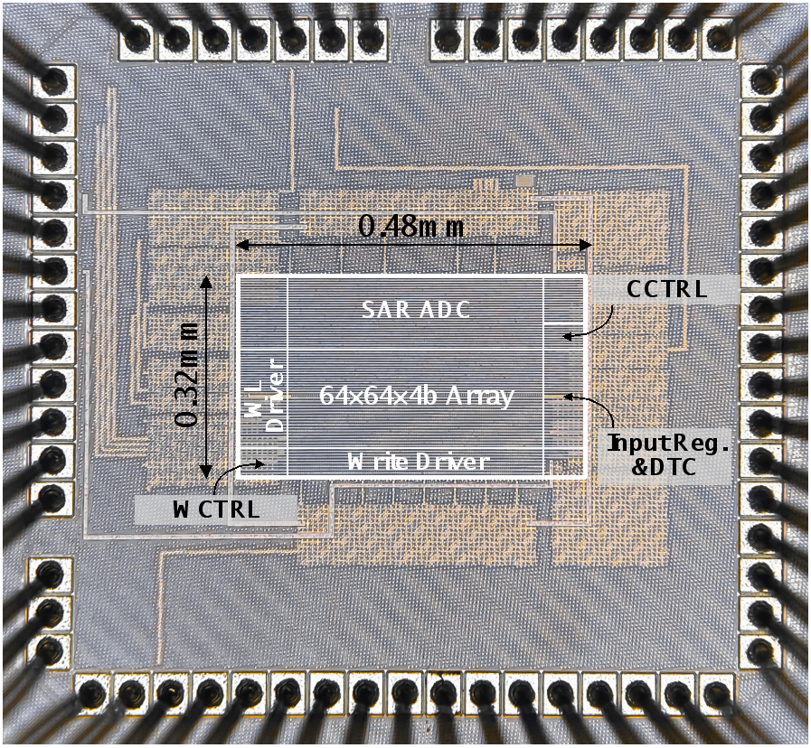 基于上述创新设计,课题组研制了一款基于65 nm CMOS工艺的电流型eDRAM模拟存内一体芯片,并对芯片进行了性能测试与汇报。在4-b输入/4-b权重/5-b输出精度的情况下,16Kb容量的原型芯片实现了233-304 TOPS/W的计算能效与2.963 TOPS/mm2的单位面积算力,达到了电流型存算一体电路中的国际领先水平。该创新通过将模拟权重的编程与计算统一到了电流域,大幅提高了模拟存算一体电流的计算精度与鲁棒性,可应用于边缘端AI计算场景。