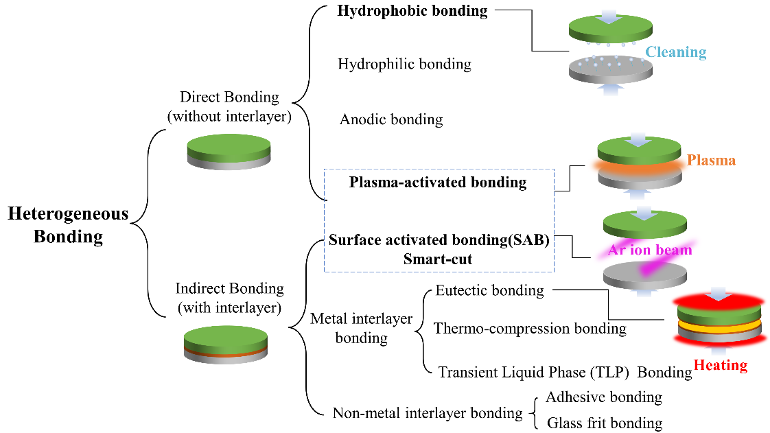 (2)针对电子器件热管理的异质集成技术.仅仅提高半导体材料的质量并不能充分解决电子器件的散热难题,对于器件复杂的多层结构,需要充分利用半导体键合技术,实现(超)宽禁带半导体与高导热材料的高效紧密结合。文章探讨了(超)宽禁带半导体中常用的亲水键合(Hydrophobic bonding)、等离子体键合(Plasma bonding)、表面活化键合(Surface-activated bonding SAB)和智能切割(Smart-cut)技术等异质键合方法,并对不同方法制备的(超)宽禁带半导体的界面TBC进行了较为全面的总结对比。