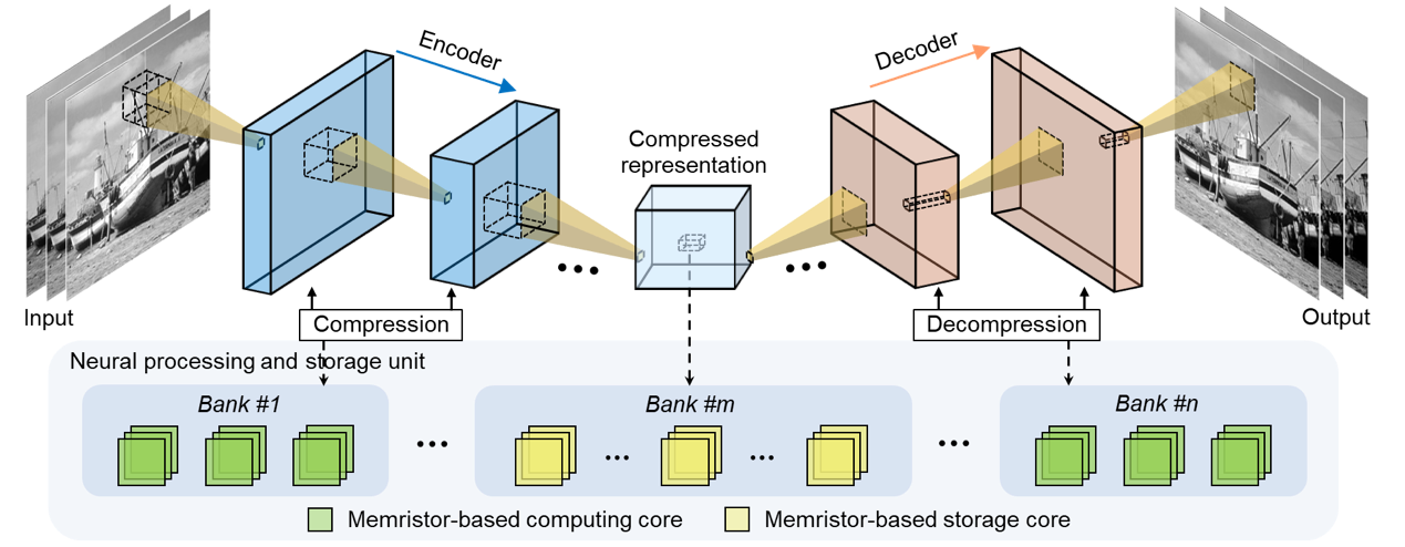 随着大数据时代的到来以及人工智能的飞速发展,以图像为代表的海量且高速生成的多源化数据给当前的存储系统带来了严峻挑战。传统的图像存储基于冯诺依曼计算架构,采用JPEG、JPEG2000、BPG等编码对图像进行压缩后存储于机械硬盘、固态硬盘(闪存)等外存。然而,在应对当前图像存储需求时,上述过程仍存在一定的挑战:在编码层面,传统技术中固定模式的时域-频域变换和量化矩阵,使其在应对多源图像数据压缩任务时难以同时获得高质量还原图像和高压缩效率;在器件层面,基于磁盘和闪存的等外存设备由于器件单元的存储容量有限,制约了存储密度的进一步提升;在架构层面,由于外部存储单元与处理器单元分离,导致图像数据在压缩和解压缩过程中需要反复传输,造成了大量时间和能量的损耗,限制了存储效率的提升。