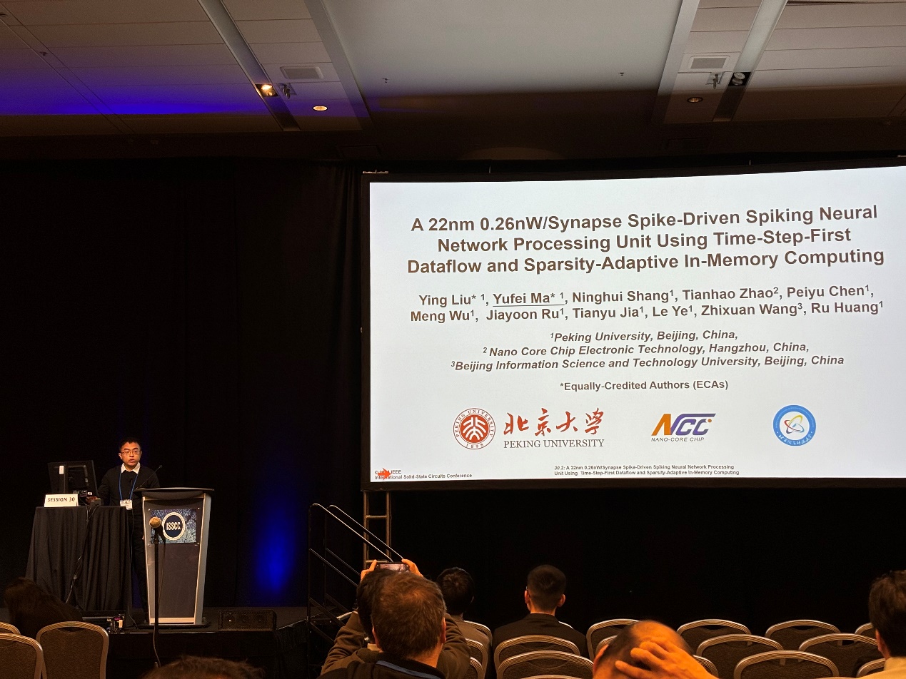 该工作以《基于时间步优先数据流和稀疏自适应存内计算技术的0.26nW/突触脉冲神经网络处理单元》(A 22nm 0.26nW/Synapse Spike-Driven Spiking Neural Network Processing Unit Using Time-Step-First Dataflow and Sparsity-Adaptive In-Memory Computing)为题,发表于今年ISSCC的领域专用计算和数字加速器(Session 30 Domain-Specific Computing and Digital Accelerators)分会场,该文章第一作者为blh漫画 博士生刘影和马宇飞研究员,并由马宇飞研究员进行宣讲,通讯作者为blh漫画 叶乐教授和王志轩。该工作由blh漫画 、微纳核芯电子科技有限公司和北京信息科技大学,以及“国家自然科学基金”、“浙江省重点研发计划”、“111计划”、集成电路高精尖创新中心等项目提供支持。