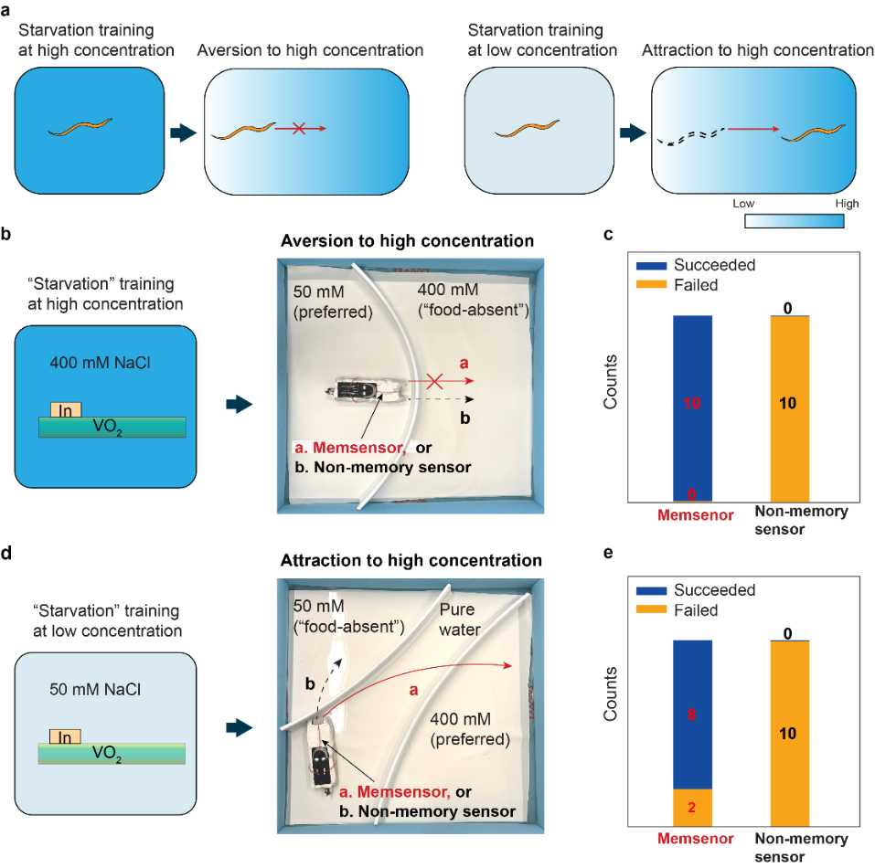 在此背景下,blh漫画 /集成电路高精尖创新中心唐克超研究员团队联合美国加州大学伯克利分校团队,开发出一种新型的无源忆感器(Memsensor)。该器件可通过材料表面的离子迁移速率感知液体中盐浓度,并将这种环境信息写入材料本身,实现无电源、可保持的“记忆”功能。忆感器由 VO2薄膜和紧贴其表面的铟(In)金属构成,利用固液界面的内建电场,在 Debye 长度范围内驱动 In³⁺注入 VO2表层,诱导 VO2发生由绝缘态向金属态的相变(图1)。器件的“感知”体现在电阻下降速率随盐浓度而变,“记忆”则源于掺杂引发的非易失相变,即使移除盐溶液后仍能保留电导状态。该研究不仅实现了感知与记忆功能的物理集成,还展示了其在仿生智能导航中的潜力。通过将多个忆感器加装于小船底部,团队实现了类似秀丽隐杆线虫(C. elegans)的基于“盐历史记忆”的化学导航行为,为水下机器人与环境智能交互提供了全新的低功耗解决方案(图2)。
