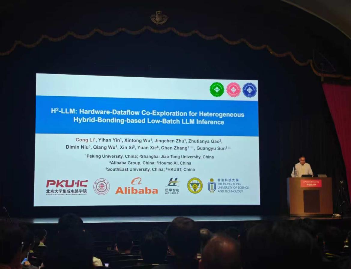 为加速边缘侧大语言模型推理,现有架构设计采用基于中央处理器(GPU、NPU等)与DRAM近存计算相结合的异构架构,对计算密集和访存密集的算子同时进行加速。然而,虽然现有DRAM近存计算架构可提供更高带宽,但将计算逻辑嵌入DRAM芯片的架构设计限制了其可提供的算力,导致其难以充分加速边缘侧推理计算。为缓解这一问题,孙广宇团队基于混合键合(Hybrid Bonding)这一新兴工艺,研发了面向边缘侧的LLM推理加速架构H2-LLM。H2-LLM提出了一套通用的近存计算架构模板,并抽象出架构设计空间,以协调混合键合工艺所固有的算力与带宽之间的权衡。基于这一架构模板,提出"以数据为中心"的数据流抽象,以充分利用异构硬件资源。在软硬件抽象的基础上,进一步提出了设计空间探索框架,为不同场景进行自动化设计寻优。相对于基线DRAM近存架构设计,H2-LLM可获得2.72倍的性能提升和1.48倍的能效提升。该工作以《H2-LLM:Hardware-Dataflow Co-Exploration for Heterogeneous Hybrid-Bonding-based Low-Batch LLM Inference》为题发表(该论文获得ISCA最佳论文奖,为中国大陆首次获得该奖项。博士生李聪为第一作者,孙广宇副教授和上海交通大学张宸助理教授为共同通讯作者)。