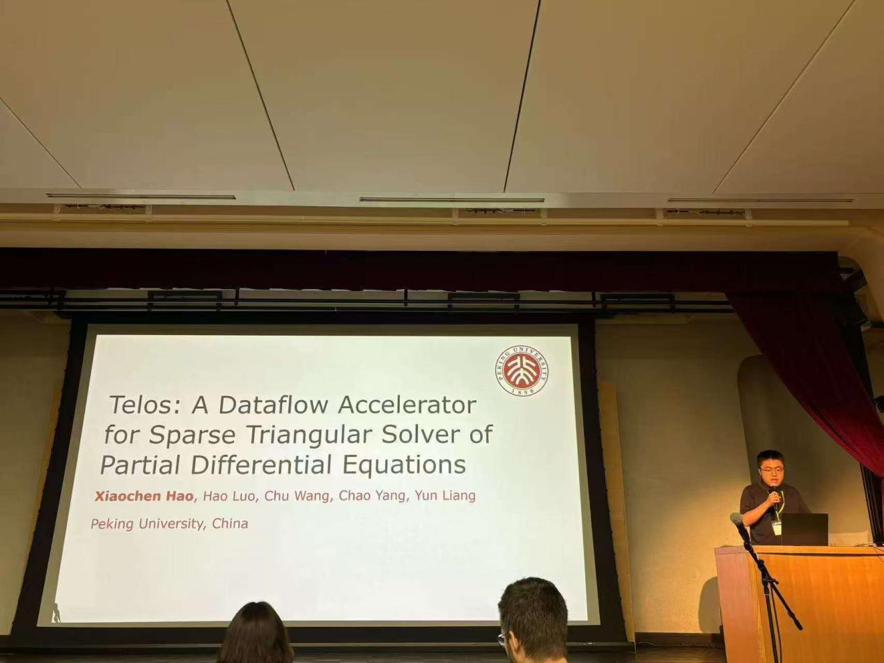 偏微分方程是众多科学问题的核心,其求解通常依赖数值方法,将方程转化为大规模线性方程组,并通过迭代方法求解。其中,稀疏三角求解(SpTRSV)因其强数据依赖性成为求解器的主要性能瓶颈。然而,现有研究难以有效发掘复杂依赖模式中的并行性和数据局部性,制约了硬件性能的发挥。本工作提出了一种针对偏微分方程求解的定制加速器架构。该架构充分利用由模板计算生成的矩阵结构化稀疏特性,通过数据流架构设计实现高效的流水线并行,大幅降低数据依赖管理的开销,取得计算与通信的充分重叠。实验结果表明,该加速器相比CPU和GPU取得平均61倍和8倍的加速。该工作以《Telos: A Dataflow Accelerator for Sparse Triangular Solver of Partial Differential Equations》为题发表(博士生郝晓辰和罗昊为共同第一作者,梁云教授为通讯作者)。