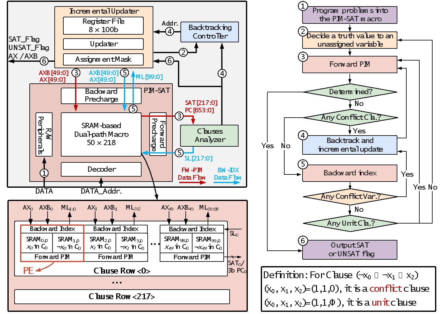 为此,blh漫画 团队提出首款支持完备性验证的K-SAT专用集成电路求解器SKADI,通过硬件架构创新确保解空间的穷尽性探索。提出的SKADI架构具有两个核心特征,分别是dual-path SRAM-based macro单元与incremental updating策略:前者通过前向计算和后向检索实现了高效的子句-文字双向推导,而后者采用路径回溯压缩技术达成历史赋值信息核心节点的线性存储。在28nm工艺节点上,该设计以0.2mm²的核心面积实现硬件级完备性验证,针对uf50-218标准算例达成平均17.1μs的求解时间,运行功耗稳定在3.39mW。