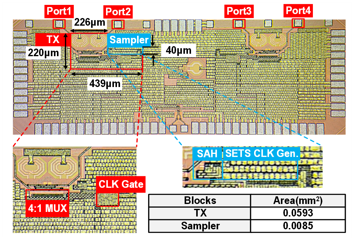 针对这一问题,blh漫画 团队研制了一款高密度无源信道信号完整性测试芯片。提出一种可编码边沿脉冲发送技术以及基于时钟门控电路的多路复用器,有效抑制发送机输出纹波的同时提高了阶跃信号高频部分的能量分布,突破了传统时域网络测量技术高频段低信噪比对测量带宽的限制。此外,团队还提出了一种基于时钟升压电路和密勒电容效应的采样保持单元,保证高带宽高线性度的同时,有效减少了沟道漏电带来的保持误差。基于以上技术,团队采用28nm CMOS工艺完成了流片验证,并进行了性能测试和汇报。芯片拥有DC到40GHz的测量带宽,单测试端口功耗仅99.5mW,阻抗测量误差达到1.2%以下,插入损耗测量误差控制在6.5%以下,是世界首款采用时域网络测量技术的无源信道测试芯片,同时也是世界首款基于CMOS工艺的信道测试芯片。