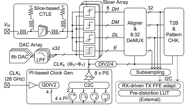 针对该问题,blh漫画 团队提出了一种多单元CTLE电路,可以同时取得较高的增益和较小的调节步长,实现了高于59GHz的模拟带宽;此外,通过提高CTLE的峰值频率减小了群延迟的波动,降低对FFE抽头数量的要求,仅使用三抽头就能在13.6dB衰减信道下实现8.1e-7的误码率;还提出了一种基于相位插值器及非线性预失真的八相位时钟产生电路,在不使用注入锁定环形振荡器的条件下,产生八相位14GHz时钟,相位误差低于3.6度。基于上述技术,研究团队使用12nm工艺流片验证了一款224Gb/s极短距接收机芯片,实现了当前模拟接收机的最高速率;能耗仅为1.11pJ/b,优于3nm工艺的数字接收机。