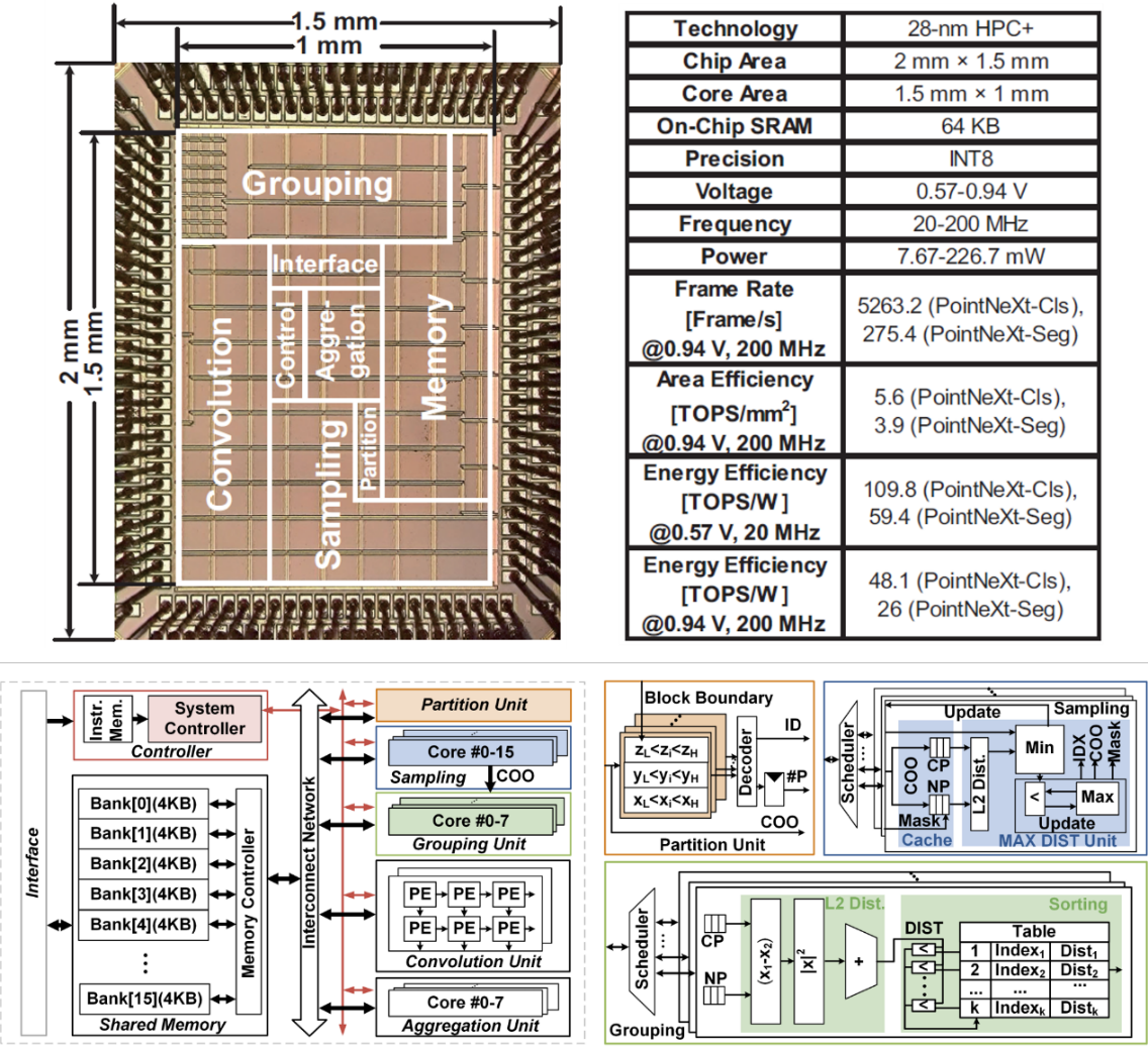 点云是由激光雷达、深度相机等新型传感器采集到的数据格式,由于只抓取物体轮廓上的点,因此相比于传统的图像和视频,点云可以用更少的数据量实现更高的分辨率,在无人驾驶、机器人、无人机、AR/VR等领域有着巨大的应用前景。深度学习技术(点云神经网络)也开始广泛应用于点云的分析和处理。此次信息工程学院的研究工作旨在解决当前点云神经网络计算复杂度高、并行性差以及频繁的不规则外部内存访问,导致在硬件上部署点云神经网络面临的巨大挑战。该研究工作开发了一种用于三维点云分析的高能效神经网络加速器 Nebula,采用基于八叉树的自适应分块、基于采样的多级跳过以及基于流水线的分块延迟聚合,分别解决了点云神经网络中最远点采样的串行计算带来的高延迟、大量的冗余计算以及频繁的非规则访存。该工作采用了28纳米工艺进行了流片验证,芯片的峰值能效达到了109.8 TOPS/W(20 MHz,INT8),峰值帧率和峰值面积效率分别达到了5263 fps和5.6 TOPS/mm2(200 MHz,INT8),远超当前的国际领先水平。此项研究工作为后续在自动驾驶、机器人等新兴领域的应用提供了广泛的思路。