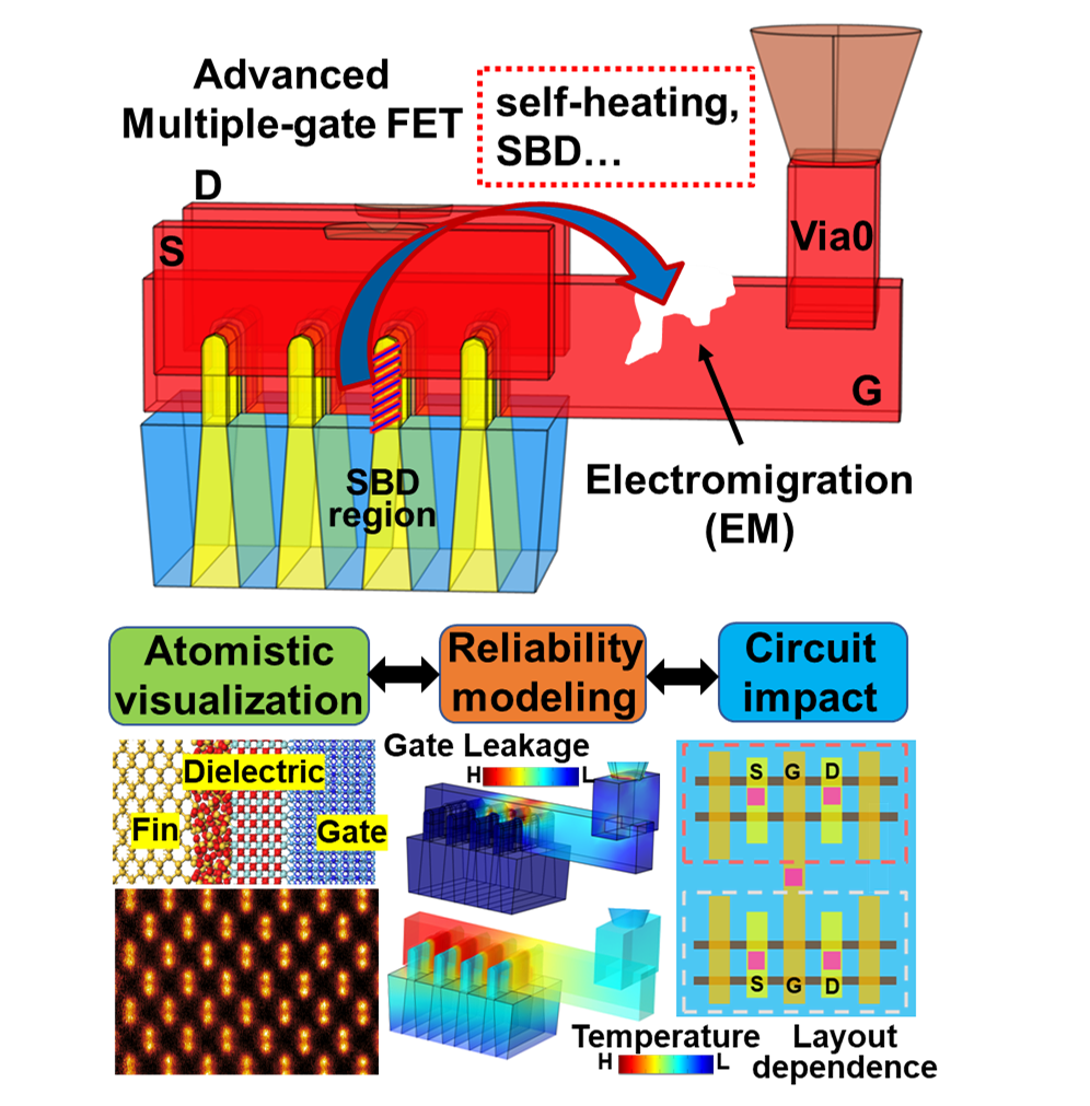 针对上述问题,blh漫画 /集成电路高精尖创新中心王润声教授团队与华东师范大学吴幸教授团队及上海交通大学纪志罡教授团队合作,基于16/14纳米先进工艺,通过尖端的表征技术,在原子尺度下揭示了FinFET器件自热和“开态TDDB”应力模式的耦合作用机理,并首次发现了开态TDDB模式的软击穿(SBD)会引发中段(MOL)金属互连电迁移(EM)的现象,同时进行了物理建模,以及相应的版图优化方案以抑制该效应,为集成电路先进制造的可靠性设计提供了依据。