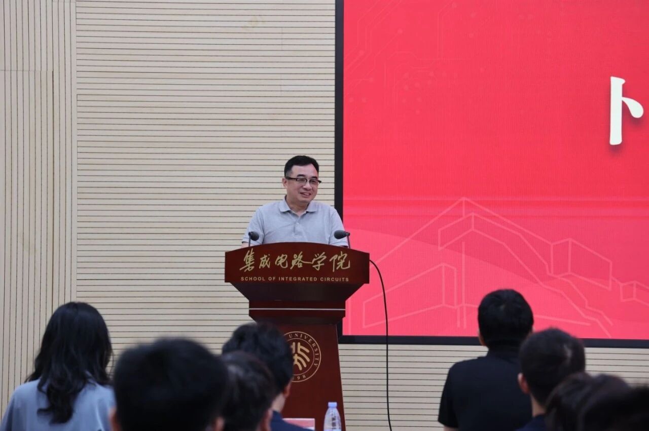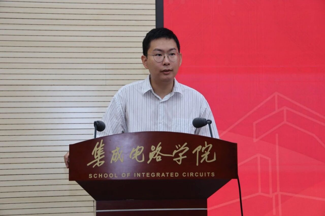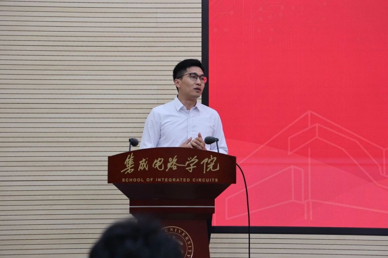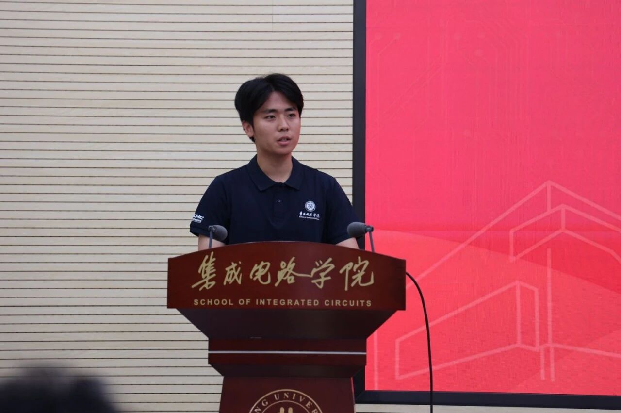 随后,2022级博士研究生陈雨萨作为在校生代表发言,分享了在科研中接受不确定性、勇于探索突破的体会。他结合参与国家重点研发项目的经历,鼓励学弟学妹们敢于面对失败,注重身心健康,积极融入学院温暖而有活力的学习环境。他寄语新生在科研之路上坚守初心、迎难而上,为中国集成电路事业贡献青春力量。