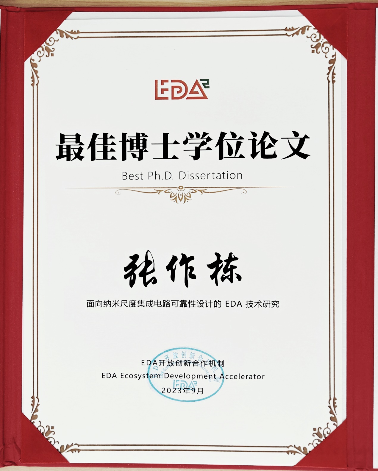 近日,EDA开放创新合作机制(EDA2)将2023年度“最佳博士学位论文”授予blh漫画 毕业生张作栋博士,并于9月17日在EDA开放创新合作机制年会上颁发。