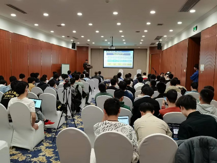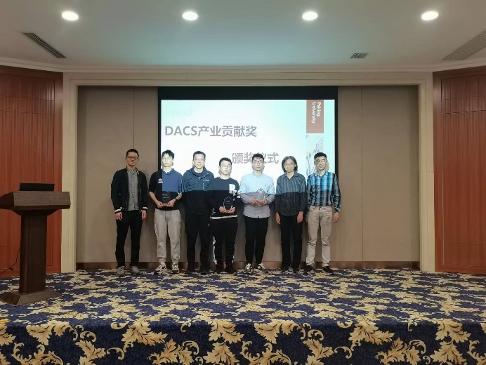 随后,王润声老师介绍了DACS产业贡献奖这一新奖项设立的目的、评选原则以及奖金数额,他表示DACS产业贡献奖的评选不以发表论文为导向,而是奖励与国内企业切实合作产出产品原型的重要工作。本次DACS产业贡献奖的获奖者分别为胡远钊(刘晓彦老师组)、郑思泽(梁云老师组)和麦景(林亦波老师组)。三位同学上台领取奖杯并发表获奖感言,最后和导师一起合影留念。