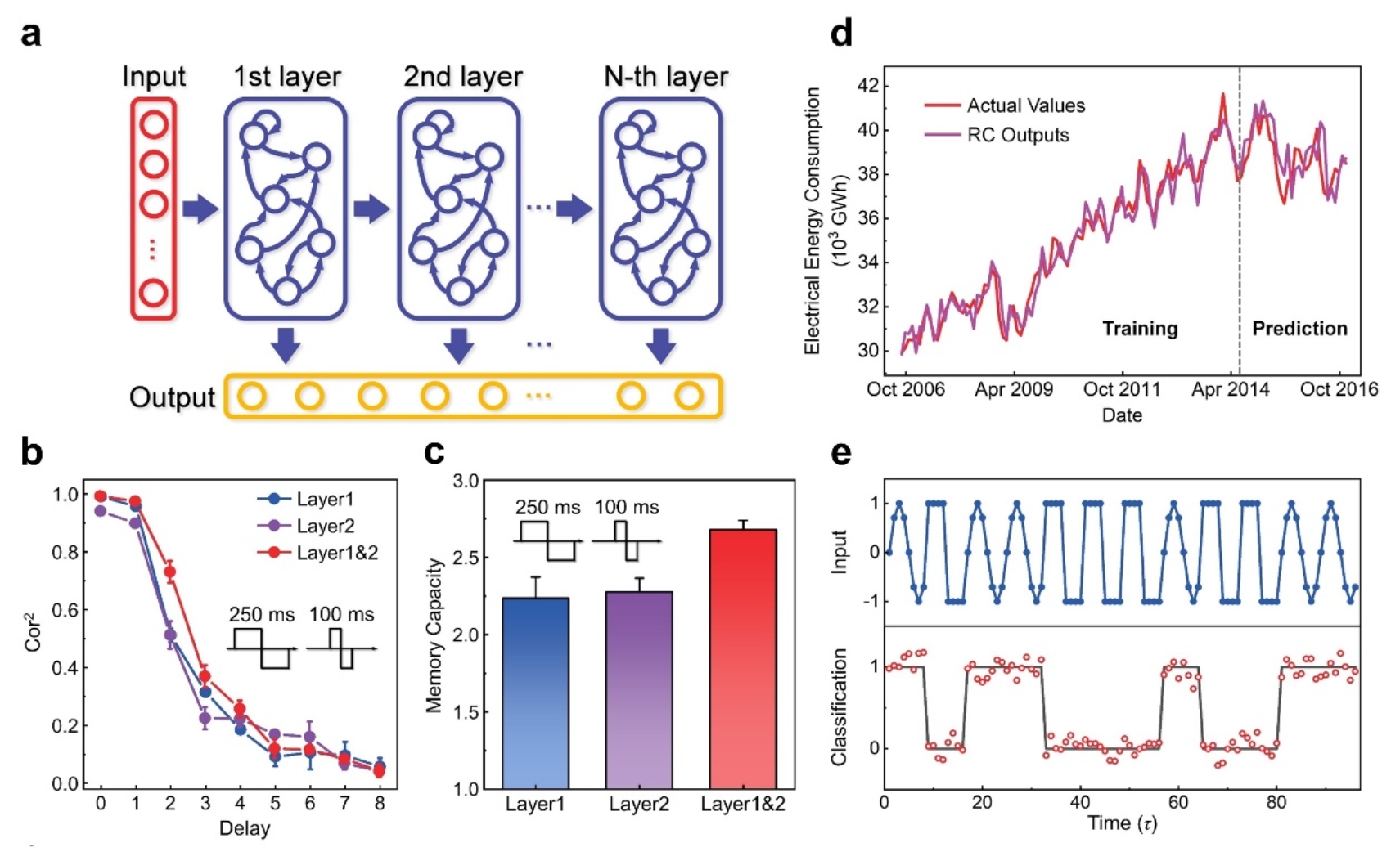 在技术路线上,blh漫画 研究团队首先研制了可级联的单层储备池硬件,通过将动态忆阻晶体管与平面器件进行串联分压,实现了电压输入、电压输出的短时程非线性单元。由于输入和输出为相同的物理量,解决了通常情况下电压输入、电流输出器件难以直接级联的问题,为构建深度储备池计算硬件奠定了器件基础。基于该类短时程非线性单元,作者进一步制备了深度储备池硬件系统,并结合分时复用的虚拟节点方法获得了丰富的储备池状态。实验研究结果表明,相比同等规模的单层储备池计算系统,本工作所构建的深度储备池计算硬件具有更大的记忆容量、更丰富的储备池状态数、层次化的信息处理能力,并在波形分类、电能消耗预测等任务中展示了优异的性能,证明了深度储备池计算系统在时序信息处理任务中的潜力。