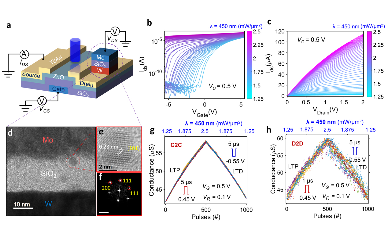 此外,光晶体管-忆阻器(One-phototransistor-one-memristor,1PT1R)阵列被应用于视觉感存一体计算任务,具备高速光图像在线学习与高精度识别功能。相关成果以“One-phototransistor-one-memristor Array with High-linearity Light-tunable Weight for Optic Neuromorphic Computing”为题,发表在《先进材料》(...