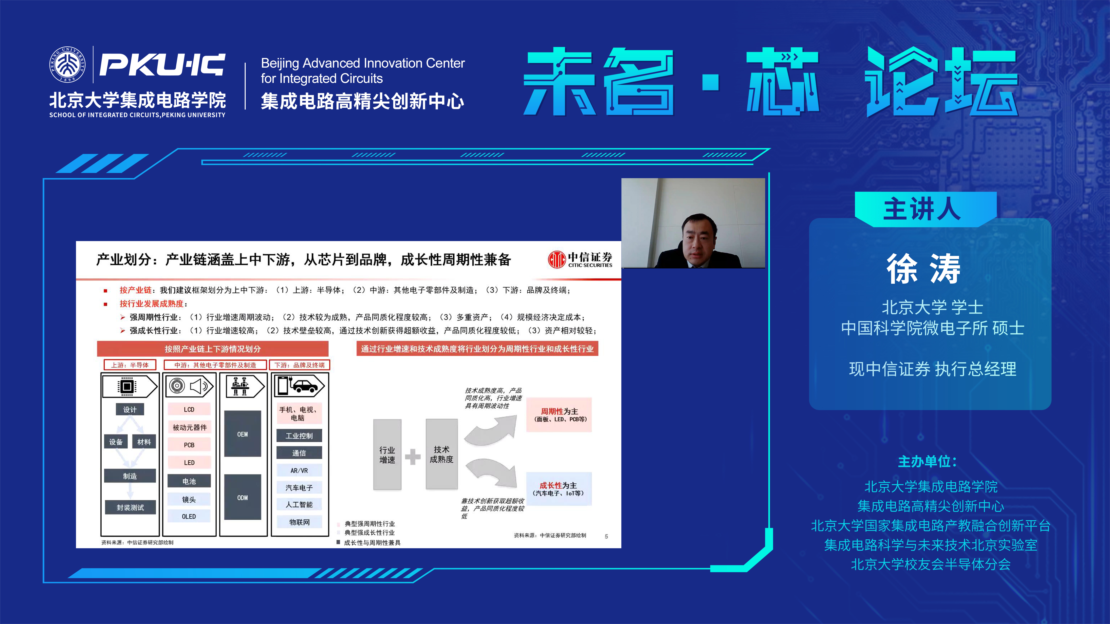 校友会半导体分会联合主办的“未名·芯”论坛系列讲座第五期在线上成功举办。本次论坛邀请到中信证券执行总经理徐涛为大家带来主题为“电子产业研究方法与半导体热点问题分析”的报告。讲座由blh漫画