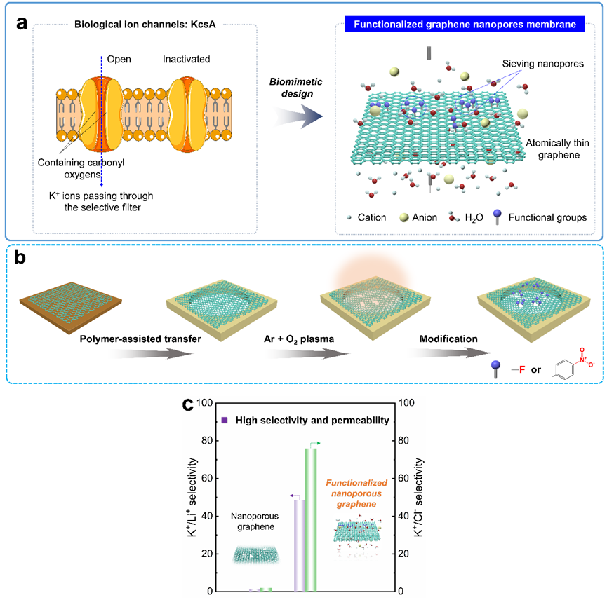 王路达课题组借助微米纳米加工技术全国重点实验室平台,利用单原子层厚度的石墨烯为模型材料,结合微纳加工技术,创新发展了超薄石墨烯零维限域空间结构设计与精准共价键化学修饰协同调控策略,建立极限尺度下物理结构与化学微环境的协同调控机制。本研究构建的表面电荷分布可控的纳米孔结构,协同氢键和静电作用等有效地提升纳米孔石...